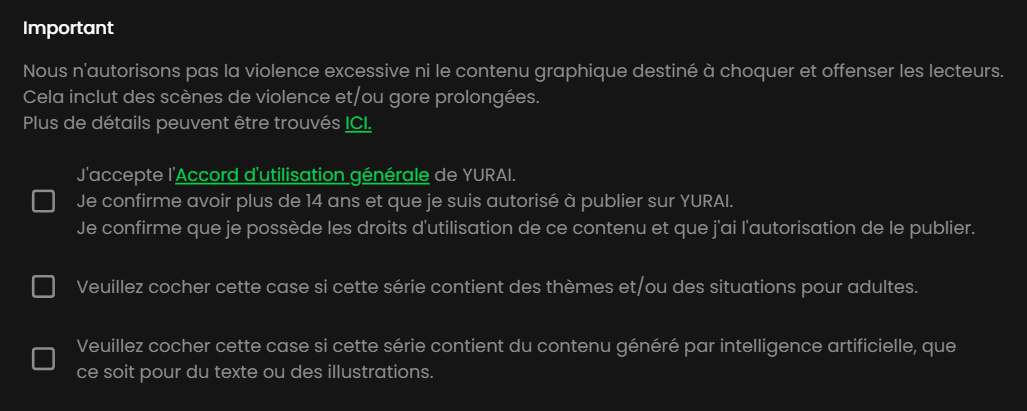 Vous devez cocher la case à cet effet si votre série contient du contenu généré par IA. Si vous essayez de sauvegarder et de publier votre série après avoir coché cette case, vous verrez un message d'erreur indiquant que ce type de contenu n'est pas autorisé sur YURAI.