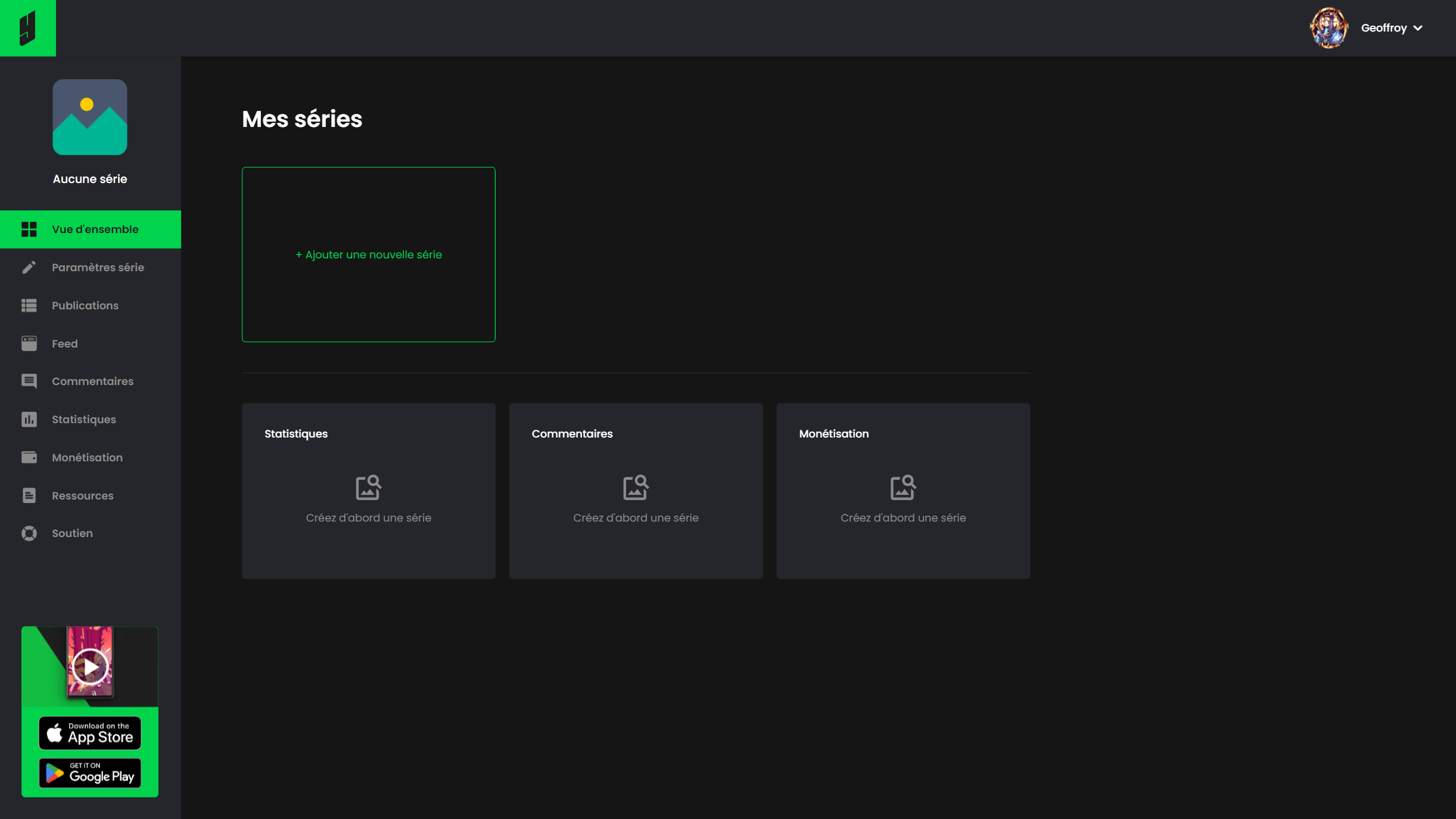 Vous pouvez facilement publier une série à partir de notre Tableau de bord pour les créateurs. Pour ce faire, connectez-vous au Tableau de bord et allez sur la page « Vue d'ensemble ». Sur cette page, cliquez sur « Ajouter une nouvelle série ».