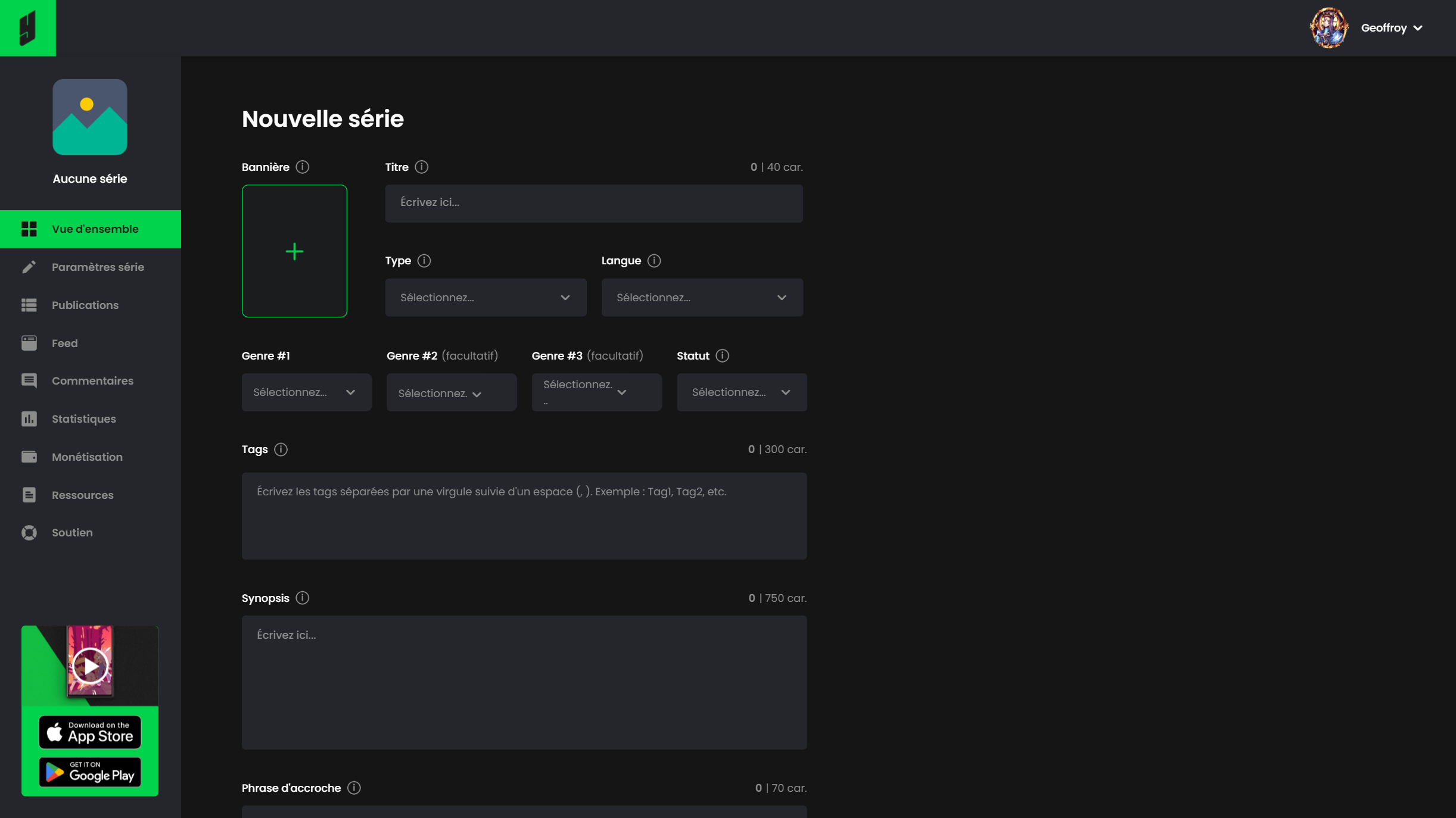 Indiquez la langue dans laquelle vous publiez votre série. Cela permet de catégoriser votre série et permet au lecteur de trouver plus facilement les séries qui correspondent à ses préférences.